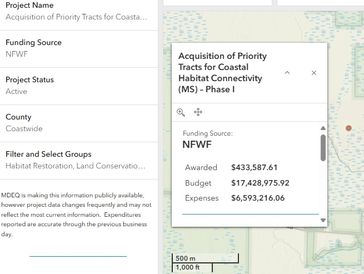 For each project on the Coastal Restoration Dashboard, MDEQ staff design and maintain corresponding Esri Story Maps. This dynamic presentation tool allows users to showcase projects through embedded interactive maps, pictures, text, and other unique features.