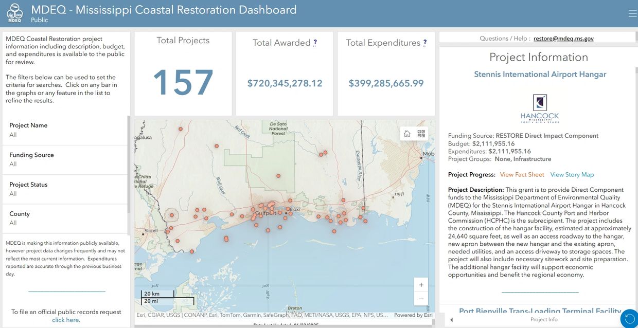 Following the Deepwater Horizon Oil Spill in 2010, the Mississippi Department of Environmental Quality (MDEQ) has prioritized the continued restoration of the gulf coast ecosystem. It was imperative to have an efficient platform for monitoring the vast quantity of projects, grants, and initiatives that are involved in this effort. The Geospatial Group worked with MDEQ to build a system that brings together a multitude of datasets into a user-friendly dashboard for stakeholders and the general public to stay informed on the state's restoration progress.