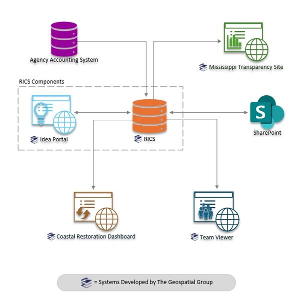 The Mississippi Coastal Restoration Dashboard is one of several tools developed by The Geospatial Group that connect to the Restoration Information Control System (RICS), a central data hub used by MDEQ to manage and track restoration efforts. This diagram shows how the dashboard fits within a broader network of integrated systems, including the Idea Portal and Mississippi Transparency Site. A custom script runs in the background of the dashboard to pull in the latest data feeds from RICS to ensure up-to-date information is being displayed. Together, these tools support data sharing, project transparency, and informed decision-making across MDEQ’s restoration programs.